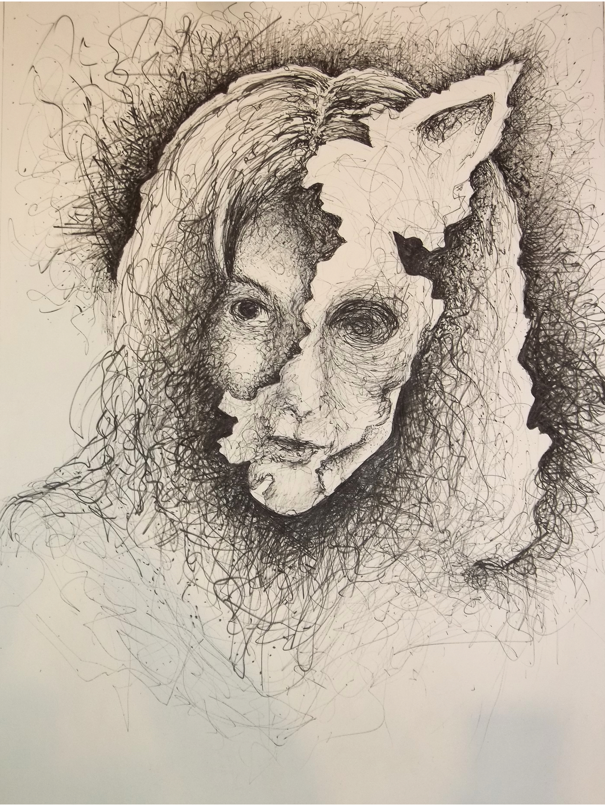 High quality matte finish of a pen ink drawing on paper. An animal shaped mask blends in with the figures own face, reflective of the natural tendency to hide our inner most self. Available in two sizes.